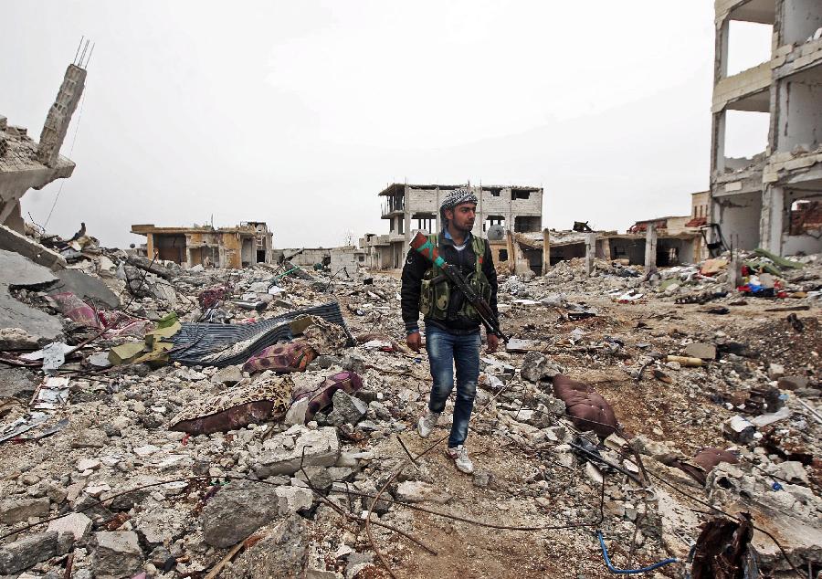 1月31日,在叙土边境重镇艾因阿拉伯,一名库尔德武装人员在废墟中巡逻。经过四个多月的战斗,库尔德人武装已经控制了与土耳其接壤的叙利亚重镇艾因阿拉伯,打击了极端组织“伊斯兰国”的嚣张气焰,也令逃亡土耳其的大批叙利亚难民重燃回乡的希望。然而,艾因阿拉伯面临的威胁仍未解除,整个小镇更是满目疮痍,严重损毁的艾因阿拉伯目前无力接收难民返乡,重建家园更是有待时日。 新华社/世界新闻通讯社