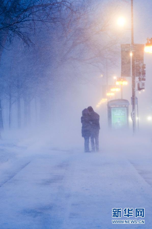 2月1日,两名美国芝加哥市民走在暴风雪中。一场暴风雪于当地时间2月1日清晨开始袭击芝加哥。据美国国家气象局说,这场暴风雪将带来持续12小时的降雪,预计将带来25厘米到41厘米厚的降雪,风速最高将达到每小时约72公里。截至目前,芝加哥民航管理部门共宣布芝加国际机场共1300多架次航班被取消。新华社记者何险峰摄