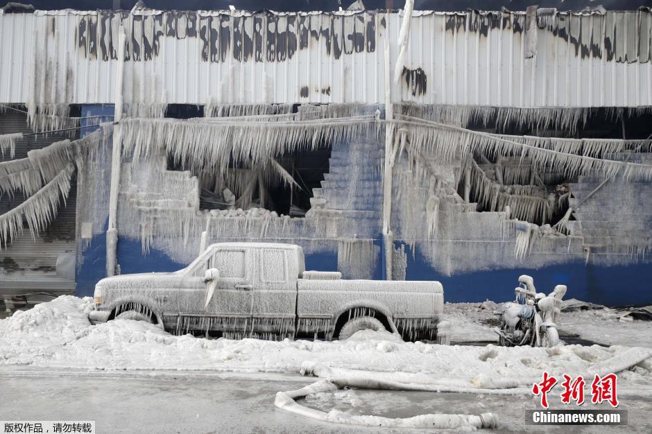 当地时间2月1日,美国纽约布鲁克林区一处仓库着火,消防员赶到后对事故现场进行喷水灭火,没想到由于气温太低,水喷出后将附近的车辆和房屋全部冻住。
