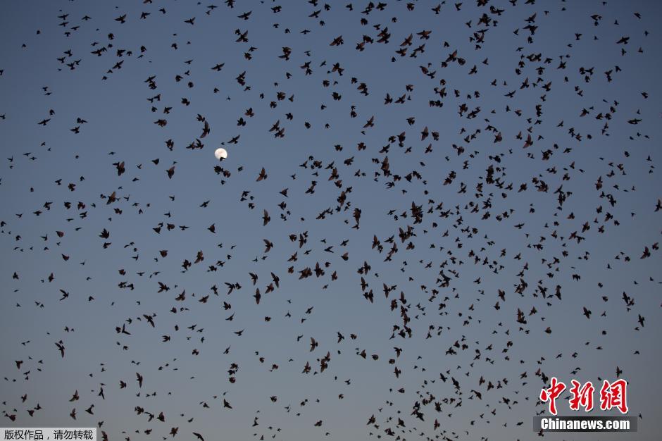当地时间2015年1月31日,以色列拉哈特,成群的椋鸟在天空中表演“群舞”。