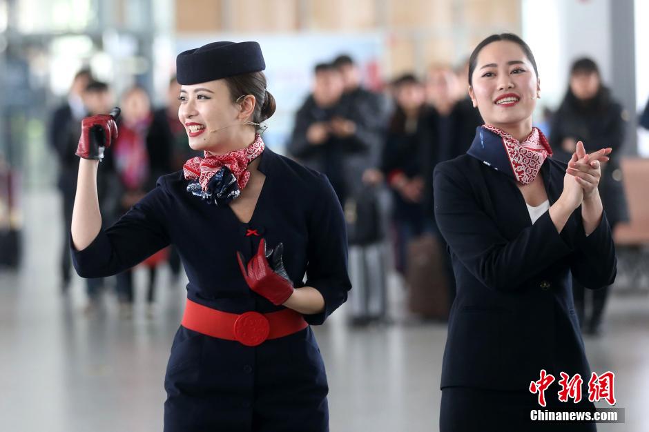 南京机场空姐“快闪”迎“温暖春运”