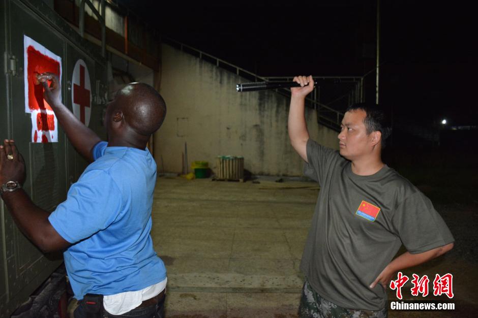 记者了解到,新一代卫生装备车运抵中国军队抗击埃博拉任务区后,解放军第二批援利医疗队迅速组织了现场培训,使医疗队员在短时间内掌握了装备性能,熟悉了操作流程。此外,官兵还为新一代卫生装备车喷绘了“五星红旗”图案。图为连夜喷绘中国标志。宋保国 摄