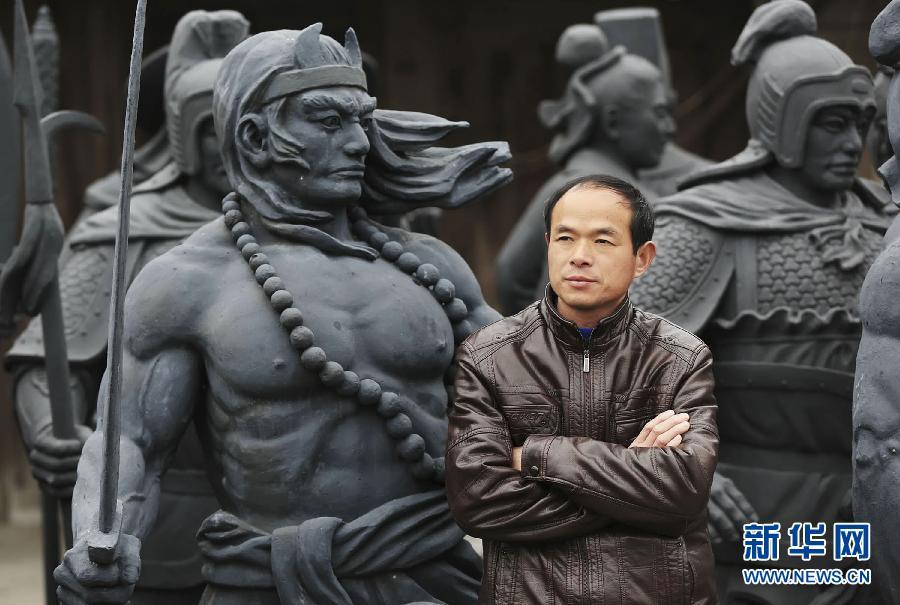 2月1日,浙江奉化泥塑艺人朱茂盛站在他创作的“水浒”人物武松的泥塑旁留影。新华社发 胡学军 摄 图片来源:新华网