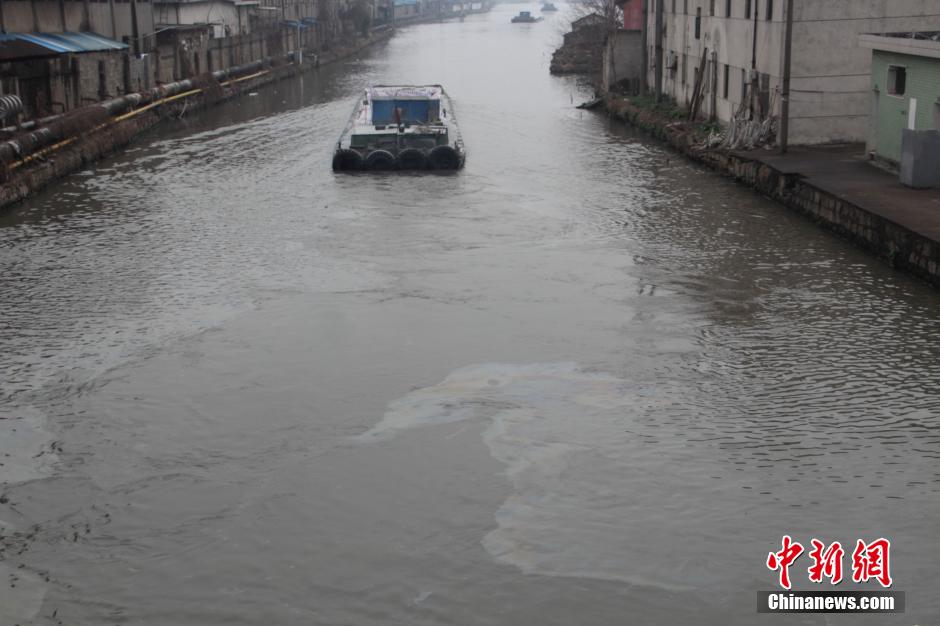 2015年2月2日中午,浙江绍兴市区独树大桥下的浙东古运河上漂荡着许多油污。据了解,这是上游过往运输船只不慎泄漏柴油漂流而来的。中新社发 李瑞昌 摄