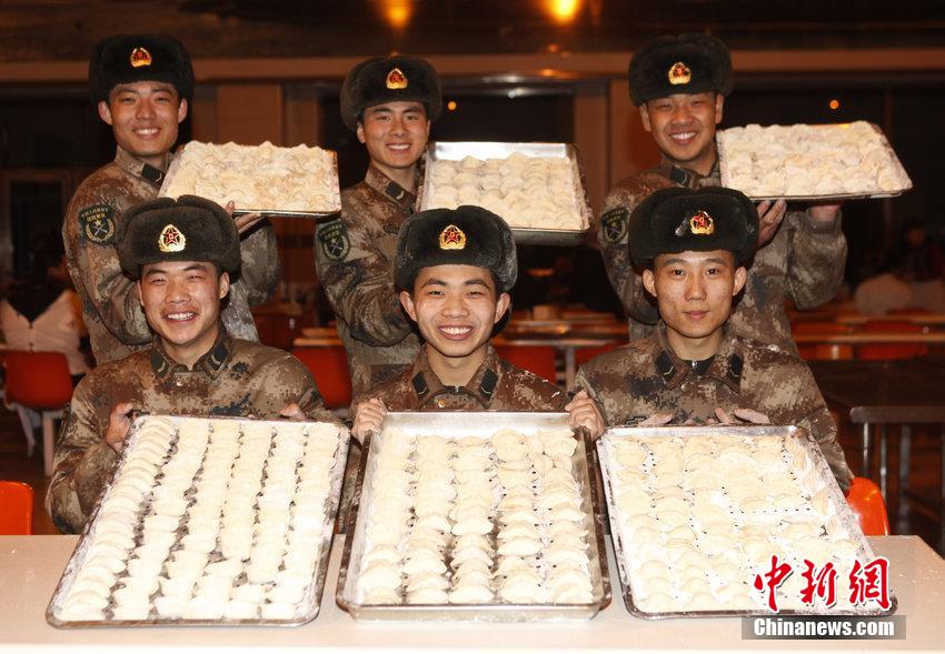 02月02日,黑龙江省黑河市,黑河市百余名群众自发走进黑龙江省军区某边防团和边防官兵一起包饺子迎新春。新包好的饺子被战士们端到零下25度的室外后,短短半个小时就被冻成了“速冻水饺”,战士们笑言大自然的极寒气温是比冷冻冰箱都好使的环保生态“速冻机”。图片来源:CFP视觉中国