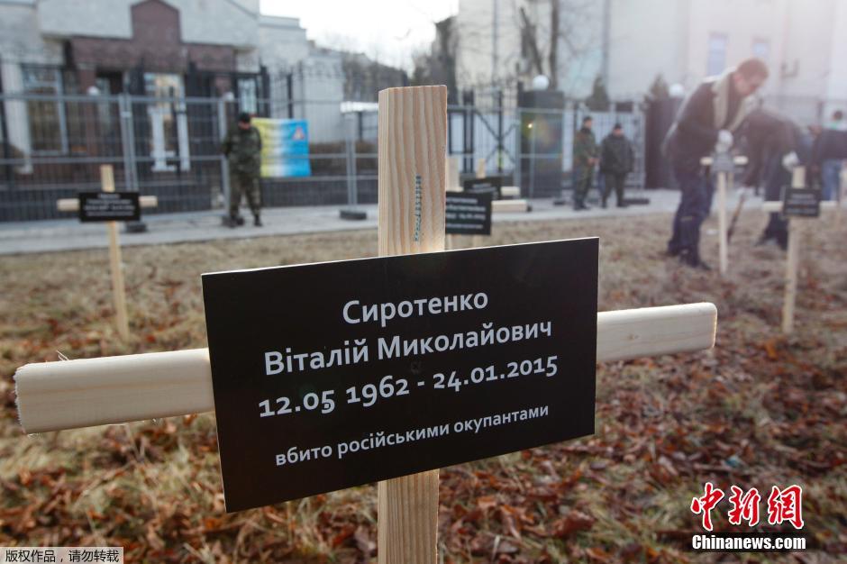 当地时间2015年2月1日,乌克兰基辅,乌克兰示威者在俄罗斯大使馆外竖立十字架,以纪念在马里乌波尔炮击中丧生的民众。示威者还要求俄罗斯停止支持乌东部的亲俄武装。当地时间2015年1月24日,乌克兰东部港口城市马里乌波尔遭到大规模炮击,至少造成30人死亡,另有约100人受伤。