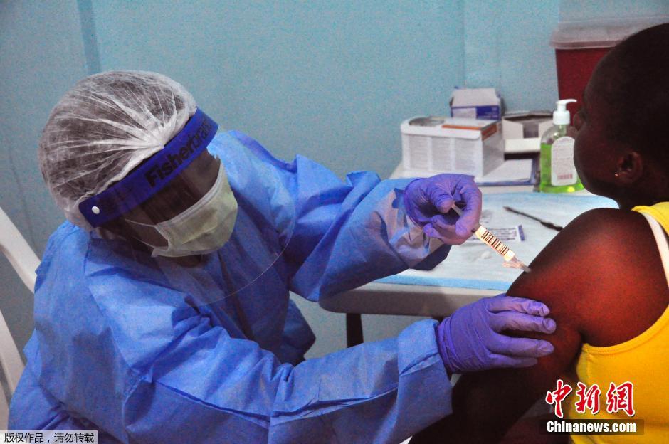 当地时间2015年2月2日,利比里亚蒙罗维亚,医护人员为民众注射埃博拉疫苗。埃博拉病毒疫苗将当日开始在利比里亚进行首次大规模试验。包括一线卫生工作者在内的近30000名志愿者接种该疫苗。