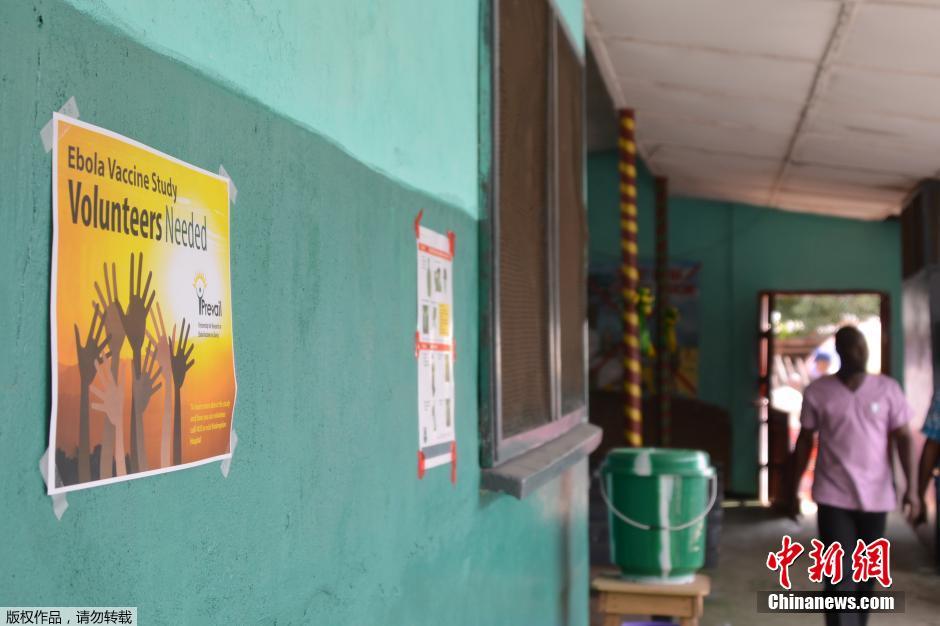 当地时间2015年2月2日,利比里亚蒙罗维亚,当地一个医院的墙上贴着征集疫苗试验志愿者的海报。