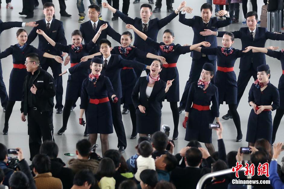 2月2日,一场主题为“温暖春运”的时尚快闪舞在南京禄口国际机场T2航站楼内上演,伴随着《天空之城》、《回家》等优美的旋律,来自东航江苏公司的空乘员工们轮番登场,帅气的空少、靓丽的空姐,动感的热舞,为即将到来的春运增添了一道别样的风景。中新社发 泱波 摄