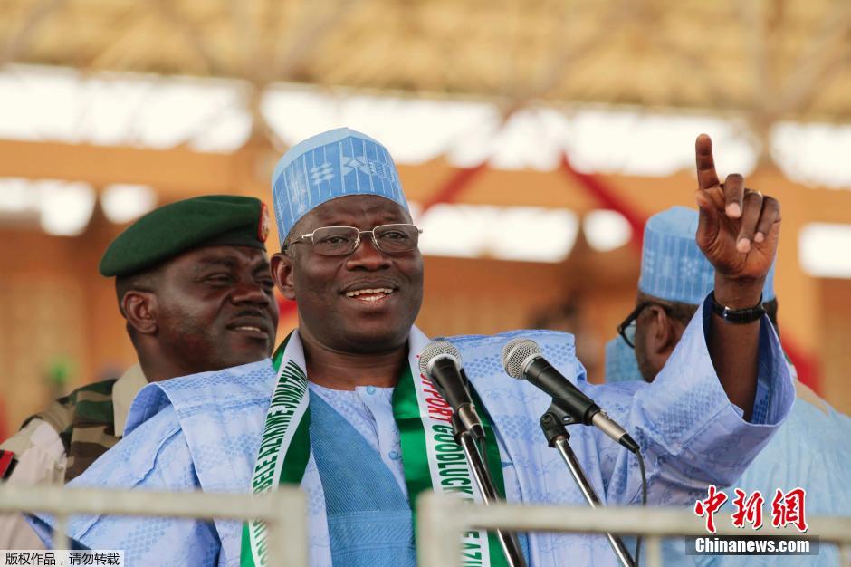 当地时间2月2日,尼日利亚北部城市Gombe的一个体育场外发生炸弹爆炸,总统乔纳森几分钟前刚刚离开在那里举行的竞选集会,这次爆炸距离乔纳森讲话的场馆仅有200米左右的距离。图为乔纳森在发表竞选演说。