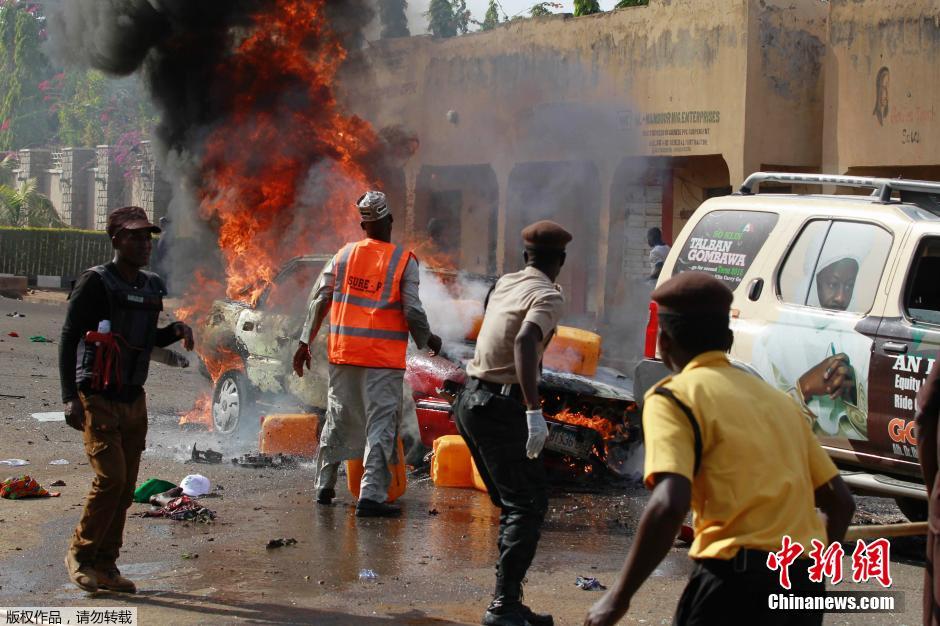 当地时间2月2日,尼日利亚北部城市Gombe一个体育场外发生炸弹爆炸,总统乔纳森几分钟前刚刚离开在那里举行的竞选集会。图为爆炸造成的汽车燃烧,人们正试图灭火。
