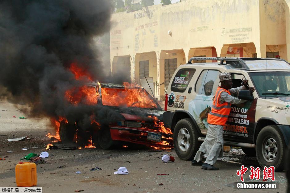 当地时间2月2日,尼日利亚北部城市Gombe一个体育场外发生炸弹爆炸,总统乔纳森几分钟前刚刚离开在那里举行的竞选集会。图为救援人员正将越野车从燃烧的汽车残骸旁推走。