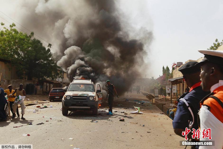 当地时间2月2日,尼日利亚北部城市Gombe一个体育场外发生炸弹爆炸,总统乔纳森几分钟前刚刚离开在那里举行的竞选集会。图为警察正疏散人群。