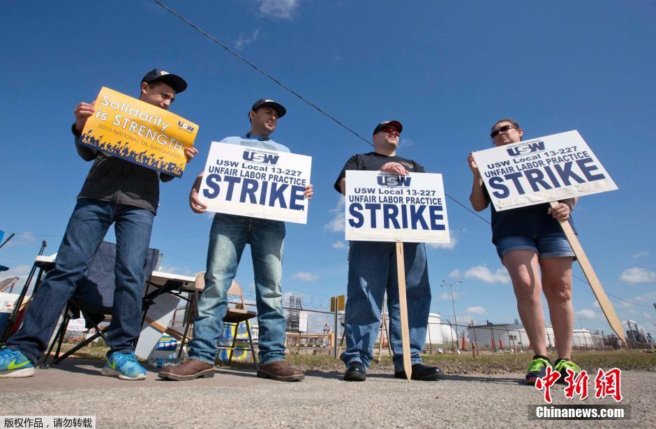 当地时间2015年2月1日,美国休斯顿,工人在莱昂德尔巴塞尔炼油厂外示威。有报道称,美国钢铁工人联合会与企业未能就一项于当日期满的劳动合同达成共识,于当天开始举行大罢工,目前涉及9个炼油厂的工人。据了解,美国钢铁工人联合会是美国最大的工会组织之一,在美国、加拿大以及加勒比海地区拥有大约1200万工人和退休人员。自1980年长达3个月的罢工以来,美国钢铁工人联合会就未曾再发起全国罢工。如果旗下工人全部参与罢工,或将导致美国64%的燃料生产中断。