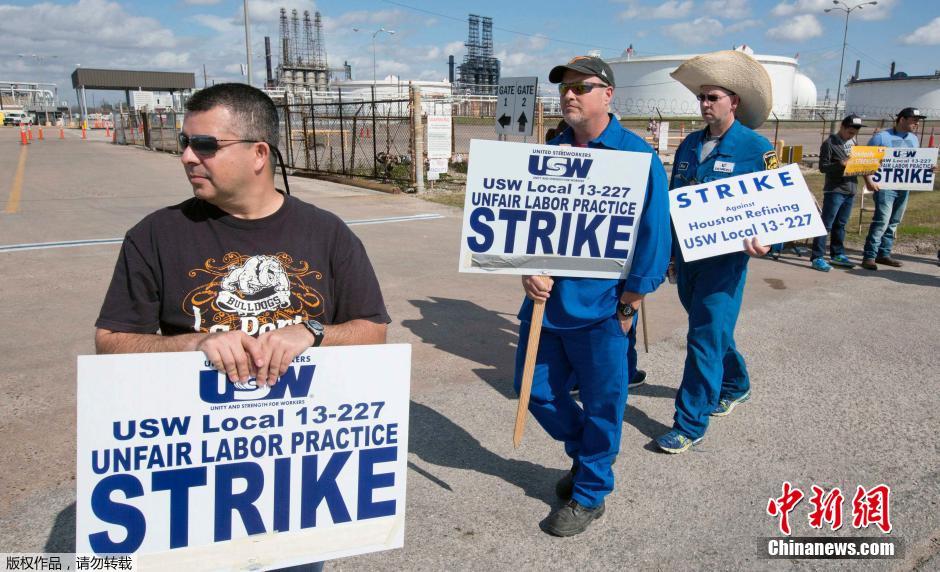 当地时间2015年2月1日,美国休斯顿,工人在莱昂德尔巴塞尔炼油厂外示威。有报道称,美国钢铁工人联合会与企业未能就一项于当日期满的劳动合同达成共识,于当天开始举行大罢工,目前涉及9个炼油厂的工人。据了解,美国钢铁工人联合会是美国最大的工会组织之一,在美国、加拿大以及加勒比海地区拥有大约1200万工人和退休人员。自1980年长达3个月的罢工以来,美国钢铁工人联合会就未曾再发起全国罢工。如果旗下工人全部参与罢工,或将导致美国64%的燃料生产中断。