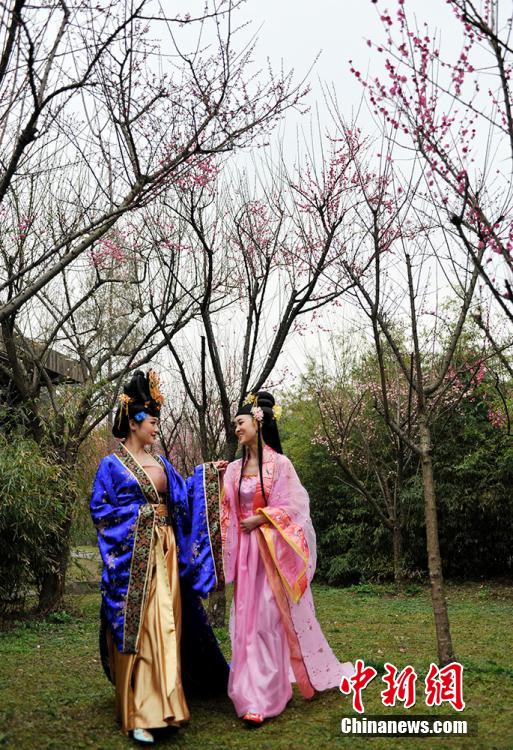 成都杜甫草堂梅花绽放 民众着古装赏梅花