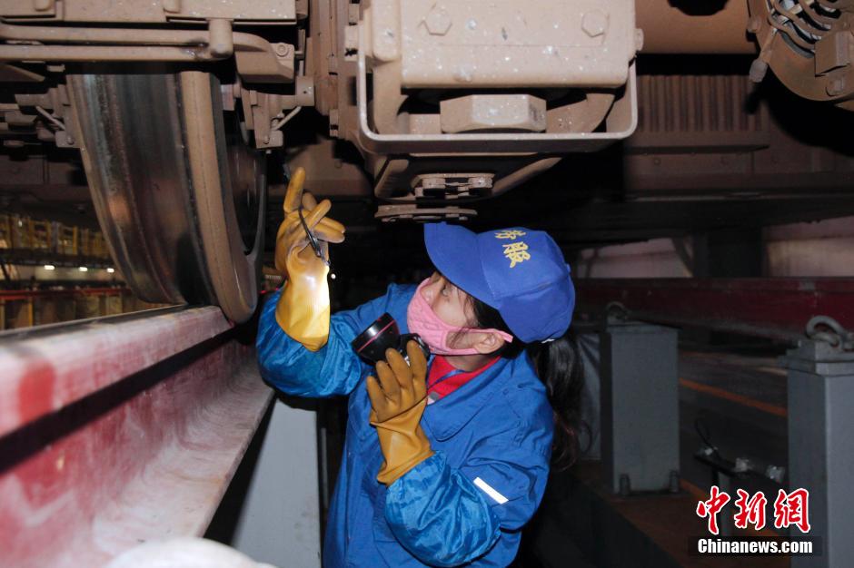 2月2日晚,清洁工人在广西南宁动车所内对动车组列车进行清洁。中新社发 宋汉涛 摄