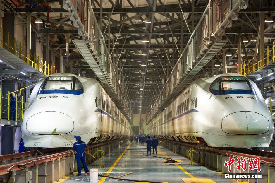 2月2日晚,清洁工人在广西南宁动车所内对动车组列车进行清洁。中新社发 洪坚鹏 摄
