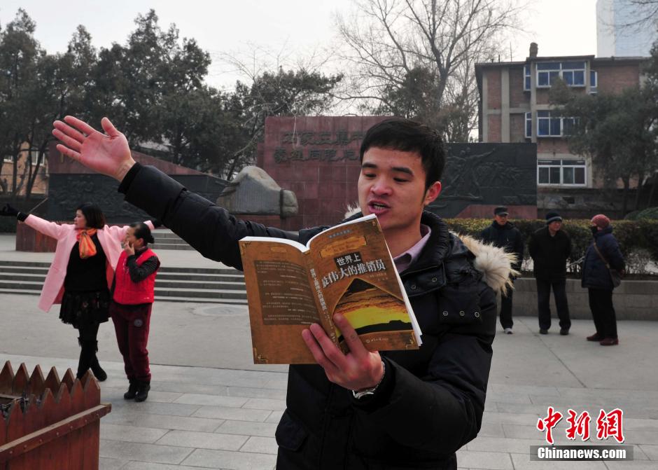 2月3日,河北石家庄平安公园内,“90后”青年吴玉华在众人面前大声演讲,还深情地演唱周杰伦的《七里香》;在场的男女老少被其克服自身生理缺陷,自强不息超越自我的励志精神吸引,纷纷鼓掌予以鼓励。吴玉华表示,为改变自己的口吃缺陷,鼓足勇气大胆走上街头、公园,甚至公交车,进行演讲,锻炼口才,增强自己的信心。 中新社发 翟羽佳 摄