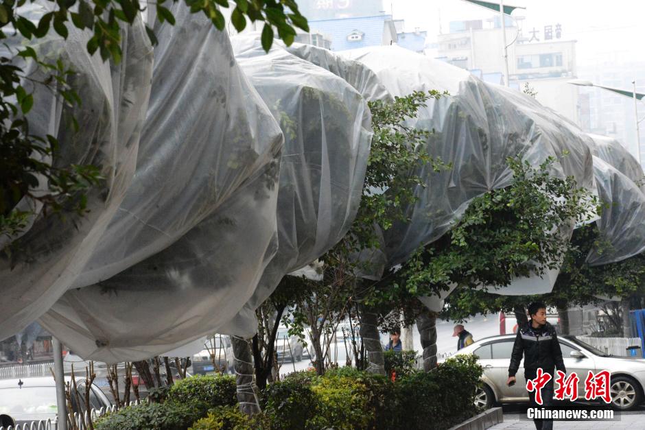 2015年2月3日,随着冷空气的来临,湖南省郴州市持续出现低温天气。该市园林绿化处结合天气情况,迅速开展树木冬季养护工作,为一些耐寒性能较弱的景观树穿上了白色的“新装”,提高它们抗病、防冻性,以亮化城市的方式迎接新年的到来。 中新社发 图片来源:CNSPHOTO 摄