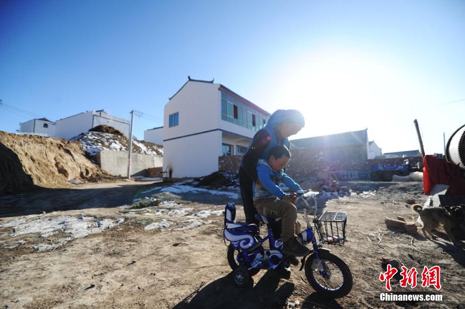 图为5岁大的包交交在自家的新楼房前骑车玩耍。杨艳敏 摄