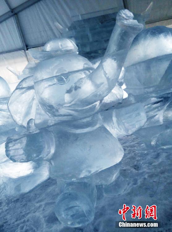 2月3日,100余种冰雕卡通人物山西太原杨家峪锦林百花园。梦幻城堡、冰雪迷宫、小熊维尼、魔幻冰岛、迪士尼欢乐世界、喜洋洋,灰太狼,米奇等主题冰雕作品分散在园中,伴随着儿童歌曲,白天冰雕晶莹剔透,夜晚时,灯光照射在冰雕人物上,更加迷人。张怡 摄