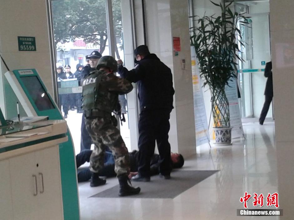 为进一步检验、提高三峡坝区公安队伍反恐处突防暴处置能力,2月3日下午,湖北省宜昌市夷陵区公安分局开展反恐处突演习。下午15时许,夷陵区某银行与公安部门联网的报警系统突然响起,警方接到群众报警称,有三名歹徒持刀正在银行实施抢劫。指挥中心当即向全警发布“警情通报”,要求各部门迅速集结开展处置,所有警种处置力量立即赶赴现场。在多部门、多警种共同配合下,仅用20分钟,突发的暴力恐怖事件被成功处置,现场秩序得以迅速恢复。陈璐 摄