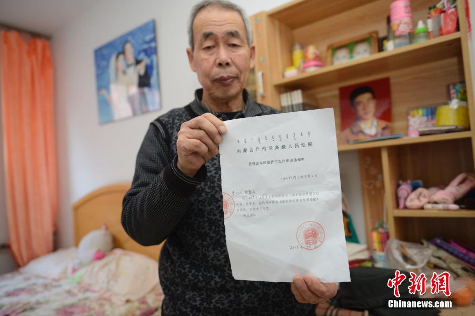 2月3日,呼格吉勒图父亲李三仁在家中手拿内蒙古高院出具的《受理国家赔偿费用支付申请通知书》。当日,呼格吉勒图父母赴内蒙古高院领取《受理国家赔偿费用支付申请通知书》,并且去银行确认了收到近206万元的国家赔偿金。刘文华 摄