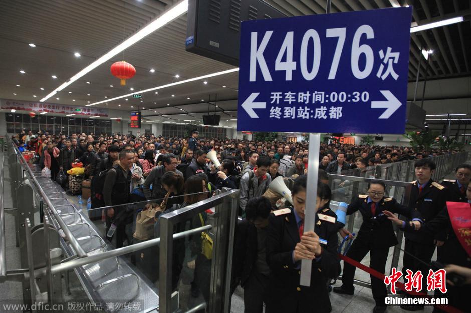 2015年2月4日凌晨,2015春运大幕开启。图为2015年2月4日,深圳火车站首趟临客,K4076次深圳-成都。肖任物 摄