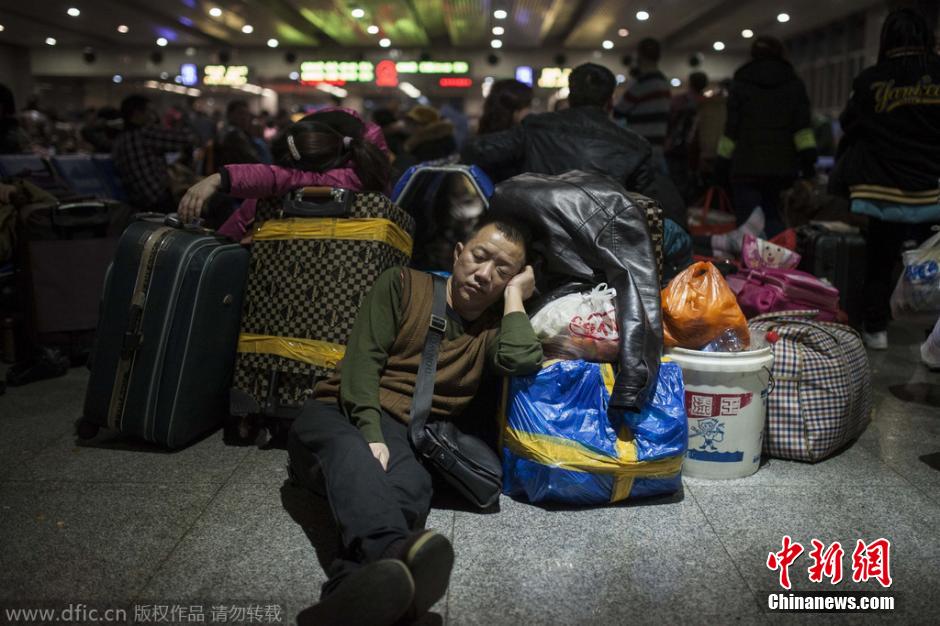 2015年2月4日凌晨,2015春运大幕开启。铁路部门认为,今年春节前客流主要是学生流、探亲流和民工返程流,相对平缓;节后以民工流、学生返程流为主,出行时间相对集中,客流高度叠加。图为2月4日,上海火车站,在候车厅内等待发车的旅客躺地上睡觉。