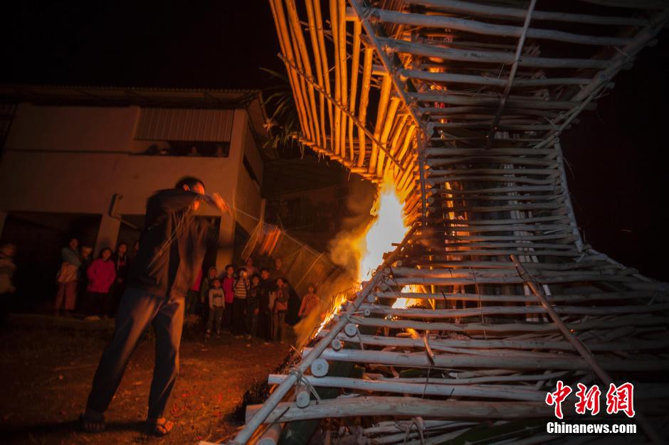 2月2日,傣历正月十四,云南芒市介桃村民小组的村民们都聚集到了娤房边,围着熊熊燃烧的白柴塔,庆祝烧白柴节,迎接春天的到来。人们把烧白柴当作一种布施而继承下来,希望得到佛祖的保佑。图为白柴被点燃后燃起熊熊大火。中新社发 张仁涛 摄