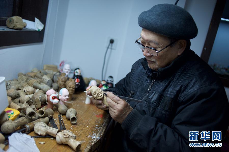 1月30日,在漳州老街始兴北路12号漳州竹初木偶艺术馆,年近八旬的漳州木偶非遗传承人徐竹初正在雕刻木偶头。 姜克红 摄 图片来源:新华网