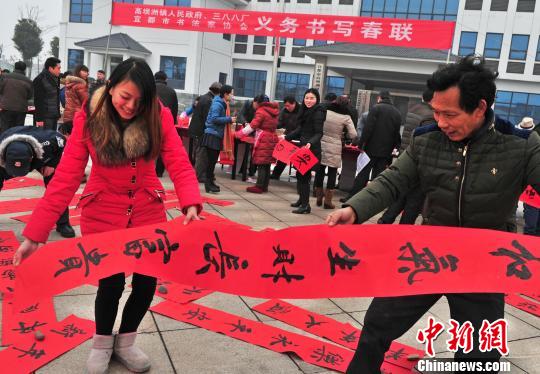当天,该市20多名书法家自带笔墨和书写春联的专用纸张,在高坝洲镇为群众义务书写春联,全天为当地群众和机关干部书写春联1000多幅。据悉,这是该协会自2004年以来,连续12年坚持为农村和社区群众义务书写春联。宜都市位于湖北省西南部,巴楚文化交融,是中国著名书法家、历史地理学家、金石文字学家和藏书家杨守敬的故乡。