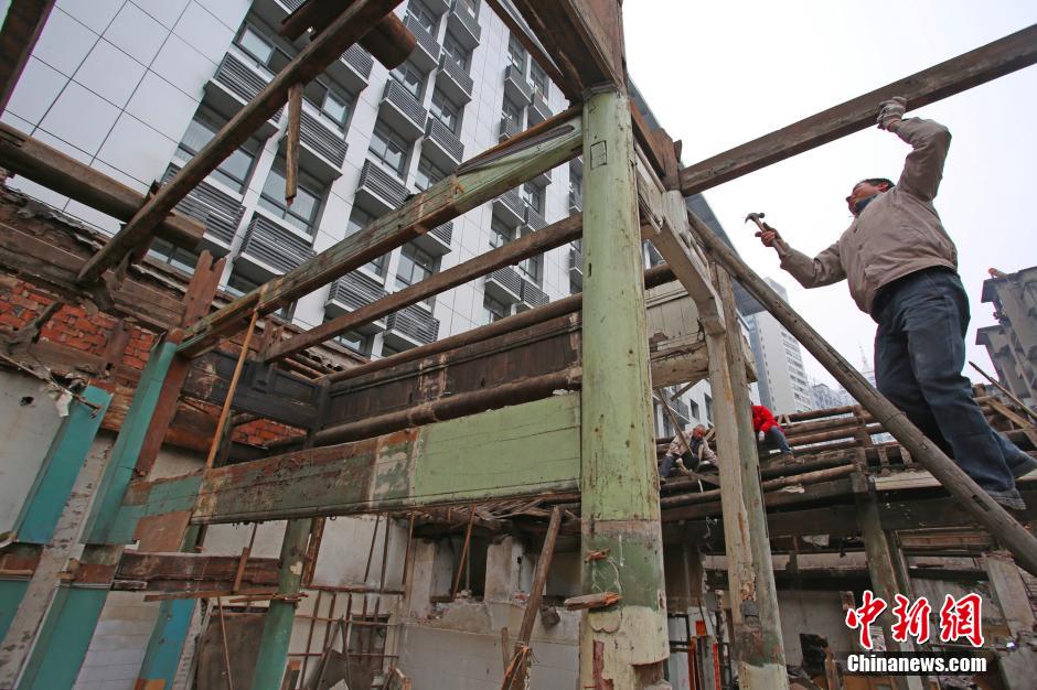 图为工作人员搬迁一栋清代古建筑。 李风 摄