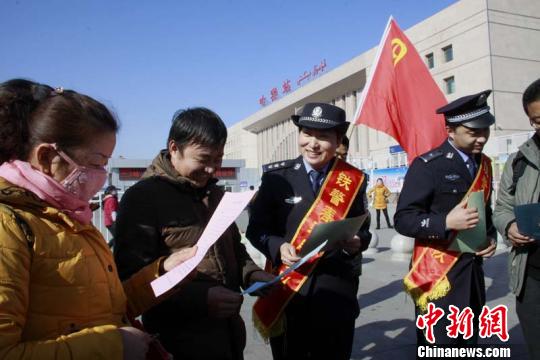 2015年铁路春运于2月4日正式启动。3日,乌鲁木齐铁路公安局哈密公安处在全力做好各项安保工作的同时,从处机关和各派出所抽调警力组建了10支“铁警春运服务小分队”,在辖区吐鲁番、哈密等八个客运站、高铁站开展了“铁警温情暖归途,安全便捷一路行”主题爱民活动,为出行旅客提供法律咨询、安全宣传、真假票辨识和志愿服务。活动中,民警们还通过安全常识问答、送福字、送平安灯笼等形式与候车旅客互动,为旅客提供温馨周到的出行服务。( 郭林摄)