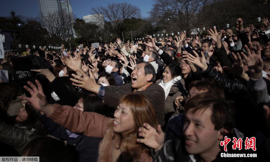 当地时间年2015年2月3日,日本东京,民众参加在当地增上寺举行的撒豆仪式(Mame-maki),由站在台上的社会名人向台下抛撒幸运豆和糖果。人们相信接到豆子或糖果能带来好运,还能驱邪。这一活动在每年农历立春前后举行。