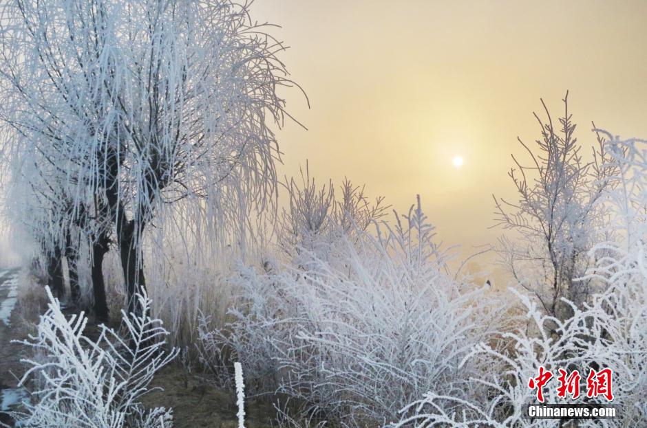 2015年2月3日,辽宁盘锦现雾凇奇观,冰清玉洁,增添了冬日的气氛。雾凇奇观吸引了不少游人拍照、留念,对北国风光迷恋不已。中新社发 李张建 摄