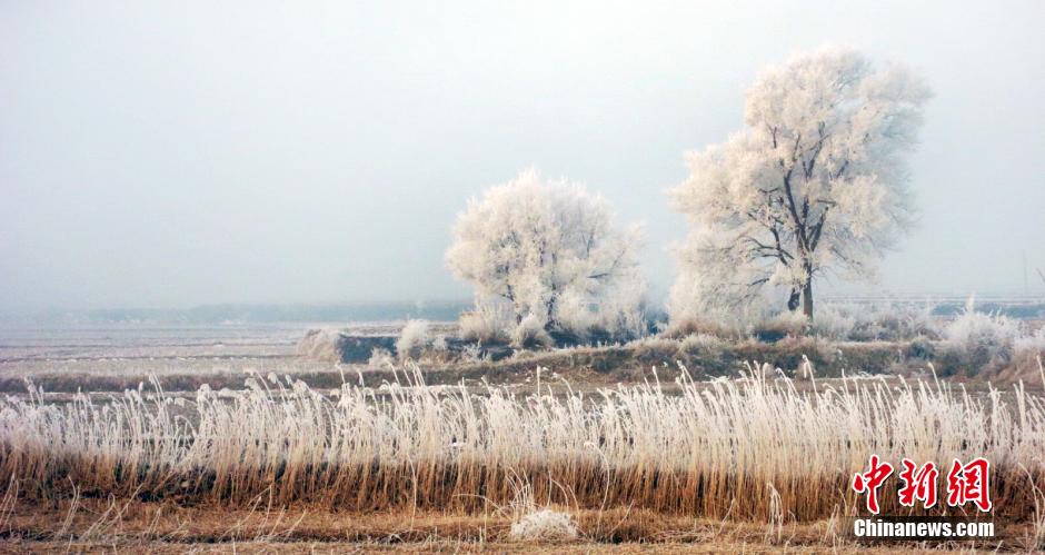 2015年2月3日,辽宁盘锦现雾凇奇观,冰清玉洁,增添了冬日的气氛。雾凇奇观吸引了不少游人拍照、留念,对北国风光迷恋不已。中新社发 李张建 摄