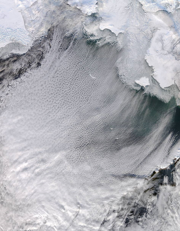 中新网2月4日电 据美国宇航局(NASA)消息,日前,NASA水文气象卫星的拍摄设备,捕捉到了白令海峡上出现震撼人心的“云道”景象。