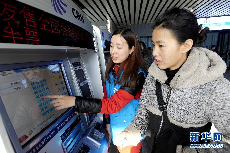 2月3日,一名大学生志愿者在沈阳北站协助旅客在自助售票机上购票。 当天,沈阳铁路局“青春志愿行温暖回家路”2015年青年志愿者服务春运活动在沈阳北站启动。据了解,该局招募了来自48所大专院校的613名大学生志愿者,将于春运期间在沈阳、大连、长春等15个车站服务,宣传铁路安全旅行常识、解答旅客咨询、协助重点旅客进站乘车、协助旅客在自助售票机上购票和取票等。新华社发(张文魁 摄)