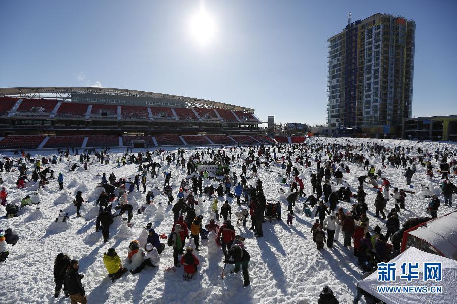 2月1日,在加拿大渥太华道明广场,人们参加堆雪人活动。 当日,近千名成人和儿童来到渥太华道明广场,参加冲击堆雪人吉尼斯世界纪录的活动。根据规定,每个雪人必须有双臂、双眼和鼻子。最终,参与者在1小时内共堆雪人1299个。2011年在美国盐湖城市举行的堆雪人活动共在1小内堆成雪人1279个。新华社发(大卫·卡瓦伊摄)图片来源:新华网