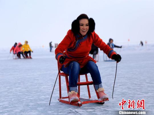 图为乌兰托娅体验冰上爬犁。 年磊 摄