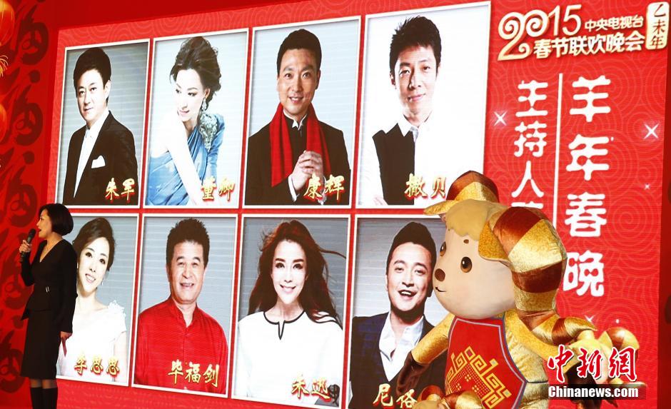 2月2日,中国央视春晚海外推介会首次在北京举办,2015年春晚总导演哈文就羊年春晚主题、节目群、吉祥物及主持人方面做了介绍。本次的主持人阵容由去年的5个人扩充为8个人,除多次主持春晚的老面孔朱军、董卿、撒贝宁、李思思、毕福剑、朱迅外,还有首次担任春晚主持人的新闻主播康辉和新生代综艺主持人尼格买提。图为哈文介绍主持人阵容。中新社发 张浩 摄