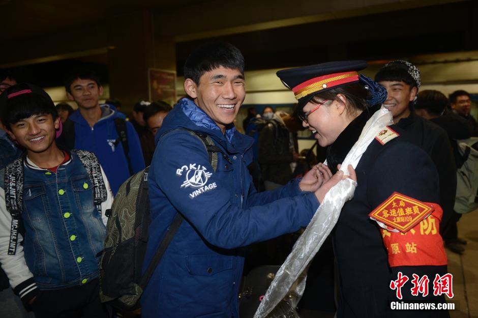 2月3日凌晨,山西太原火车站,山西大学附属中学西藏班的131名藏族学生身着时尚新潮服装,搭乘直通拉萨的Z21次过路列车返乡过寒假,他们向太原铁路职工献上洁白的哈达表示感谢。2015年藏历新年和农历春节同为2月19日,这些以往总在异地他乡过年的藏族学生难得可以回乡过年。 中新社发 韦亮 摄