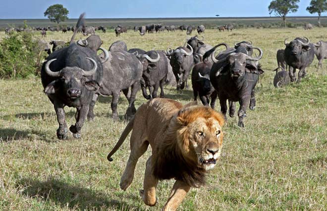 在非洲的大草原上,狮子会捕猎水牛,水牛虽然不吃肉,但也常常为了自保等攻击狮子。照片是由55岁的劳伦特雷诺和多米尼克,在肯尼亚国家野生动物园保护区中拍摄,他表示可以从狮子的眼神中看到了恐惧。