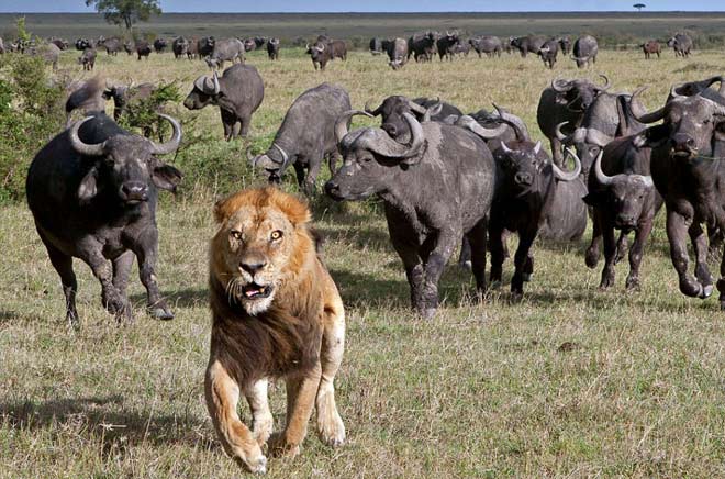 在落单情况下面对一群水牛,逃跑是明智的选择。
