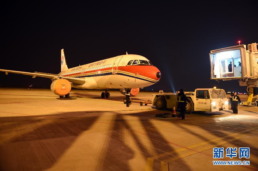 2月4日凌晨,在兰州中川国际机场,东航甘肃分公司工作人员将飞机转场至T2航站楼指定廊桥。2月4日是2015年春运的第一天,也是兰州中川国际机场T2航站楼正式启用的日子。按照计划,3日深夜至4日凌晨,兰州中川国际机场驻场航空公司及各岗位工作人员开展T1航站楼向T2航站楼转场作业,确保春运首日兰州中川国际机场正常有序运转,所有航班进出港正常。新华社记者 范培珅 摄