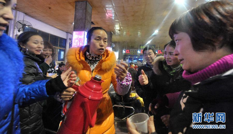 2月3日,韩无盐在告诉乘客姜汤怎么喝最舒服。湖南省株洲市环保局芦淞分局的女职工韩无盐,连续七年多时间在株洲火车站免费给旅客送姜汤,将温暖传递给旅客,被亲切地称为“姜汤大姐”。 “感冒、晕车、咳嗽、身体寒冷的旅客注意啦,这里有免费的姜汤。”2月3日夜里,记者在株洲火车站候车室看到,“姜汤大姐”韩无盐右手提热水瓶,左手提一串一次性杯子,时不时给需要的旅客倒上一杯姜汤。韩无盐学过中医,从2008年初开始,就用姜丝、红糖、盐熬成姜汤,无论春夏秋冬,只要没加班、没出差,几乎每天下班后,她都会到火车站送姜汤。据她介绍,2010年以前,平均每天送出300杯姜汤,近几年株洲西站和湘潭火车站的开通分流了许多旅客,但每天还是要送近150杯姜汤。粗略计算,7年下来,韩无盐送的姜汤总量不下50万杯,温暖了来往的旅客。谈起这些年的坚持,韩无盐笑着说:“把快乐带给别人,自己更快乐。” 新华社记者 龙弘涛 摄