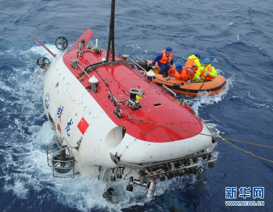 被起吊的“蛟龙”号载人潜水器(2月4日摄)。经过连夜抢修,“蛟龙”号载人潜水器水面支持系统的故障排除,于东四区时间4日5时55分(北京时间9时55分)被回收至母船,这是“蛟龙”号首次在海上过夜,离开母船22小时。 “蛟龙”号于东四区时间3日7时40分在西南印度洋注水下潜,17时10分左右完成下潜作业浮至水面。船舶上的水面支持系统A型架在起吊潜水器时,左侧马达突然漏油,A型架无法起吊潜水器,这种故障属于“蛟龙”号作业严重故障。新华社记者张旭东摄