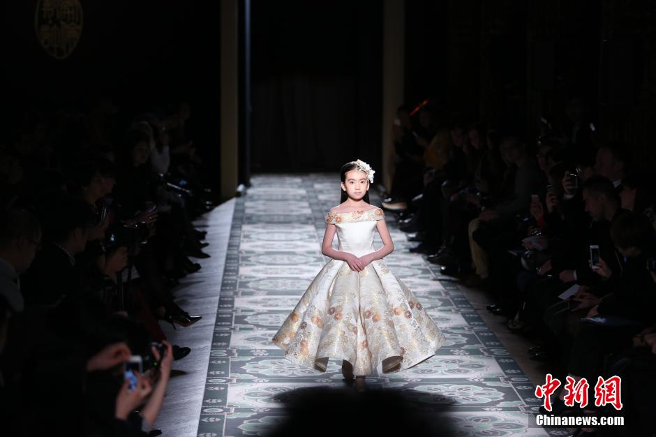 中国9岁小模特绣球第二次来到巴黎高级定制时装周走秀,在如此盛大的秀场上,面对台下几百位嘉宾和十几台摄影摄像机,绣球身着云锦礼服优雅出场,引得台下嘉宾惊叹。中新社发 宗和 摄